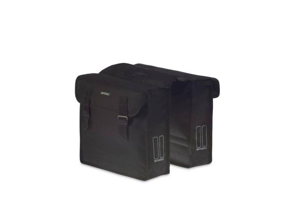 Doppelte Fahrradtasche mit 26 Litern Fassungsvermögen. Reflektierende Elemente sorgen für erhöhte Sicherheit im Straßenverkehr. Zuladung: 10 kg, maximal 5 kg pro Tasche. Befestigung am Gepäckträger mittels Gurten. Maße: 35 cm x 10 cm x 33 cm (Außenmaße). Material: Polyester.