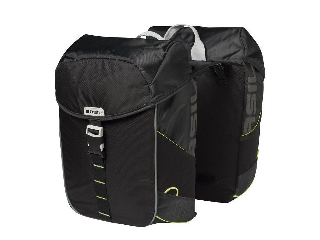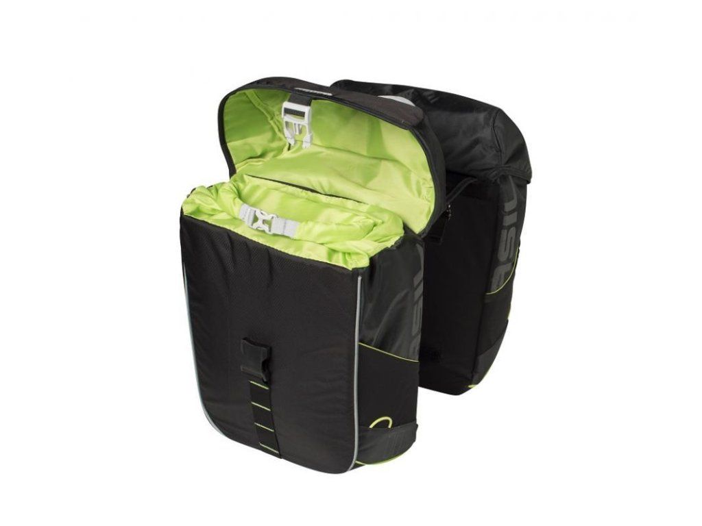 Die Basil Miles Double ist eine wasserdichte Doppel-Fahrradtasche mit 32 Litern Fassungsvermögen. Zwei zusätzliche elastische Seitentaschen bieten Platz für eine Trinkflasche oder einen Regenschirm. Ideal für Einkäufe oder entspannte Radtouren. Bei plötzlichem Regen bleiben Ihre Sachen trocken. Die Tasche ist wasserdicht und verfügt über einen Rollverschluss mit Überschlagklappe. Reflektierende Details sorgen für bessere Sichtbarkeit im Straßenverkehr. Dank mehrerer Ösen können Sie zusätzliche LED-Leuchten an der Tasche befestigen.