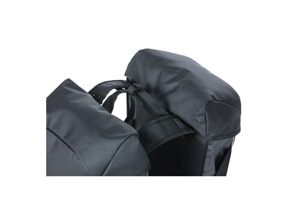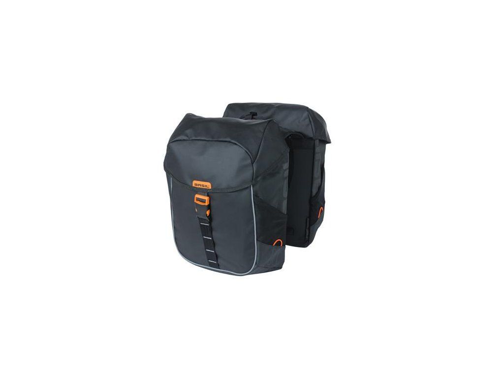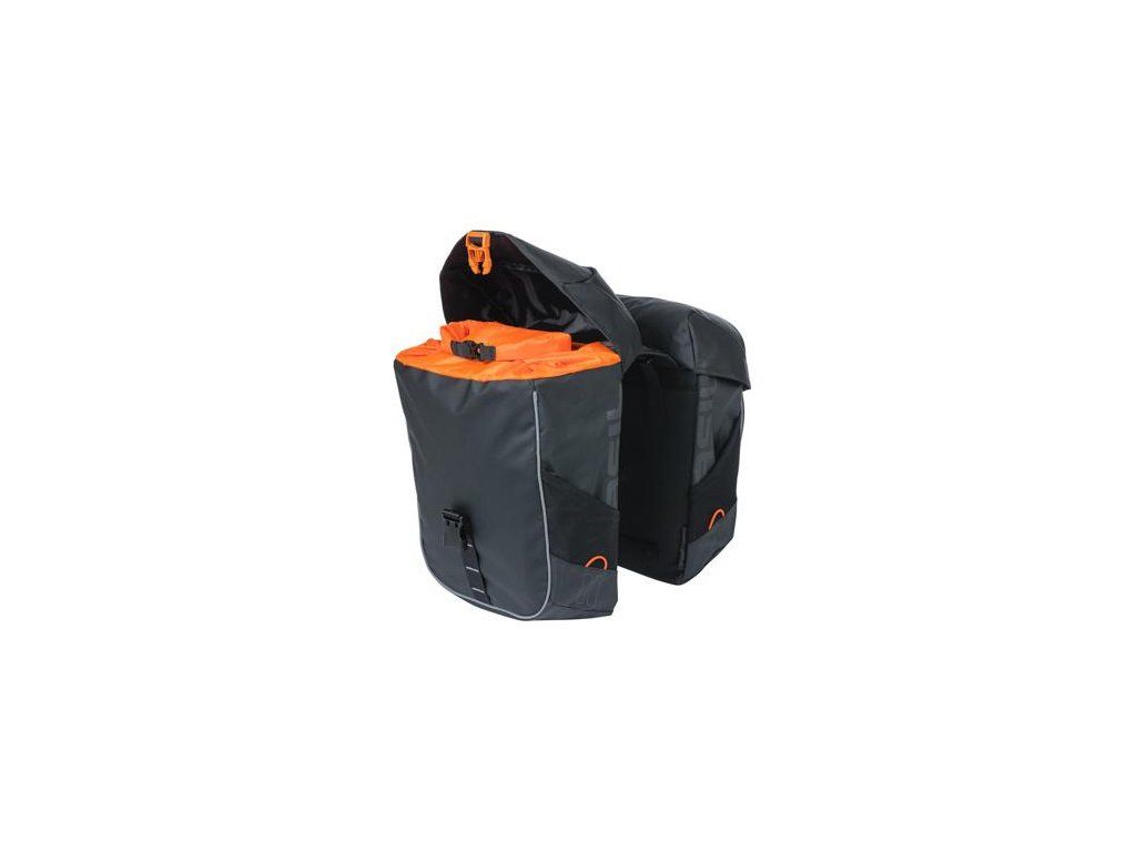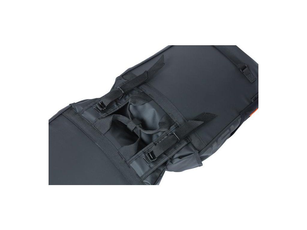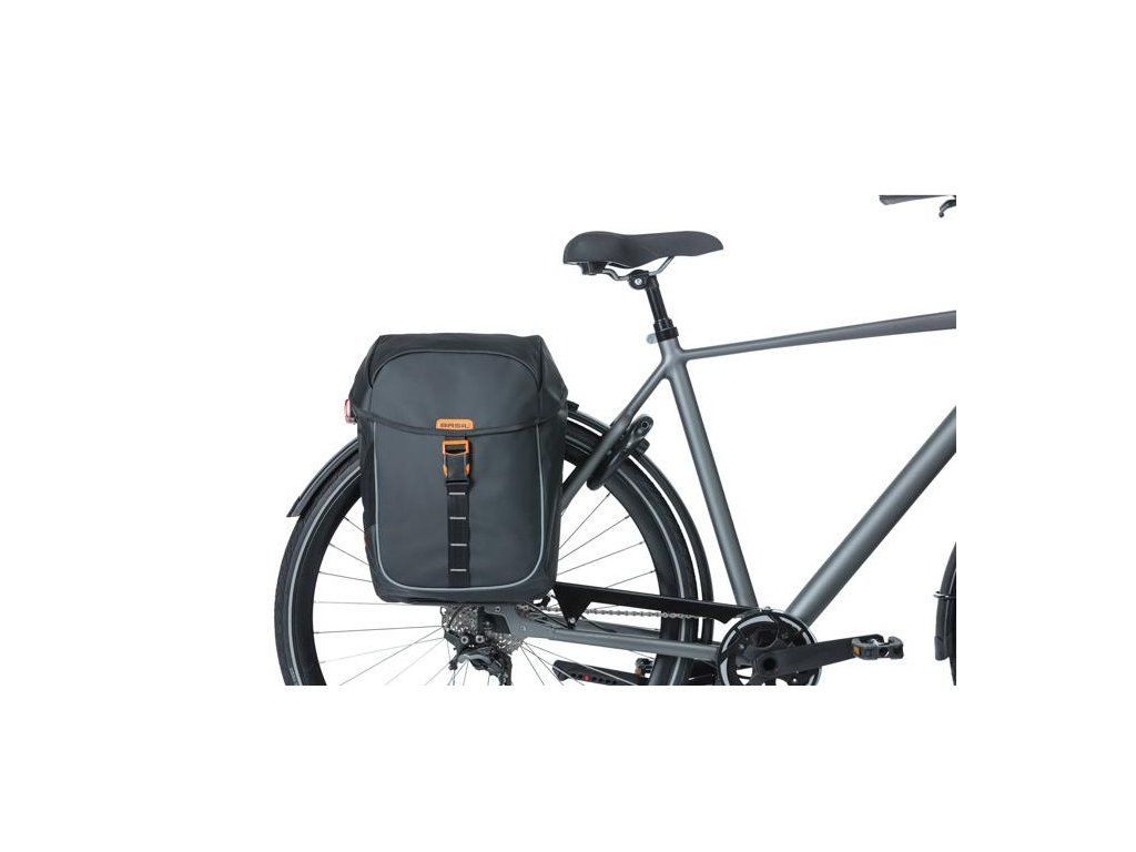 Die Basil Miles Tarpaulin ist eine sportliche Doppelfahrradtasche in Schwarz mit orangen Details. Die Tasche ist aus mattschwarzem Material gefertigt und hat ein Volumen von 34 Litern. An den Seiten befinden sich zwei zusätzliche elastische Taschen, ideal für eine Trinkflasche oder eine kompakte Regenjacke. Damit ist die Tasche perfekt für kurze oder lange Freizeitradtouren oder Radurlaube! Sollte es plötzlich regnen, bleiben Ihre Sachen trocken – die Tasche ist wasserdicht, hat versiegelte Nähte und eine Abdeckung.