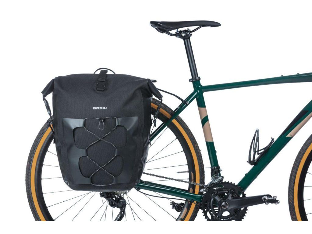 Die Basil Navigator Fahrradtasche, 100 % wasserdicht (IPX 3) und mit einem Volumen von 25 bis 31 Litern, ist die ideale Tasche für Ausflüge und lange Touren. Sie besteht aus einer Kombination aus Plane und 600D-Polyester und verfügt über einen abnehmbaren und verstellbaren Schultergurt. Helm oder nasse Jacke lassen sich dank des reflektierenden Gummibands an der Vorderseite der Tasche leicht verstauen. Die Tasche wird mit einem Rollverschluss verschlossen, der sich auf zwei Arten einrollen lässt: hinten oder oben. Die Druckknöpfe ermöglichen eine flexible Anpassung. Die Befestigung am Fahrrad erfolgt mit dem Basil Hook On System. Alternativ kann die Tasche auch mit dem verstellbaren Haken am Boden am Rahmen befestigt werden. Eigenschaften: Große Version der Basil Navigator mit einem Volumen von 25 bis 31 Litern. Wasserdichter Rollverschluss mit verstellbarem Haken. Dank des Tragegriffs und des Schultergurts lässt sich die Tasche bequem überallhin mitnehmen. Wasserdicht (IPX 3). Mit reflektierender, elastischer Vordertasche. Maße: 14 x 26 x 42 cm. Maximale Traglast: 5 kg.