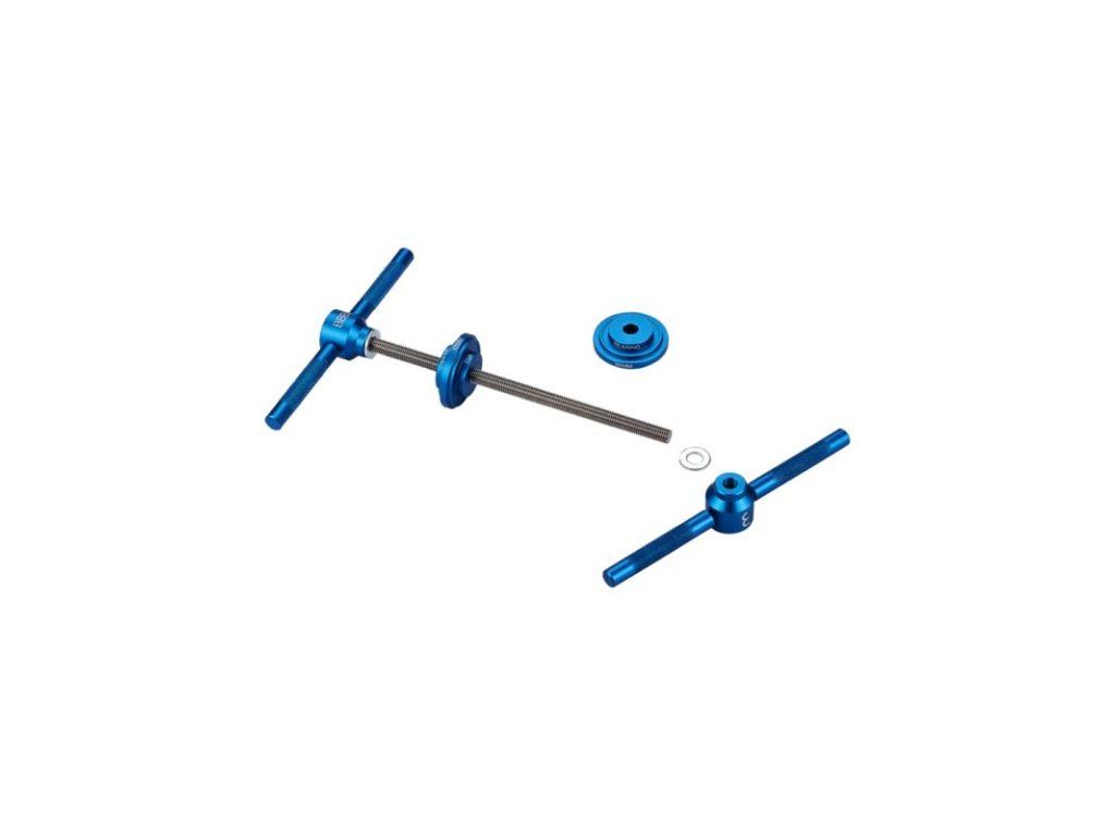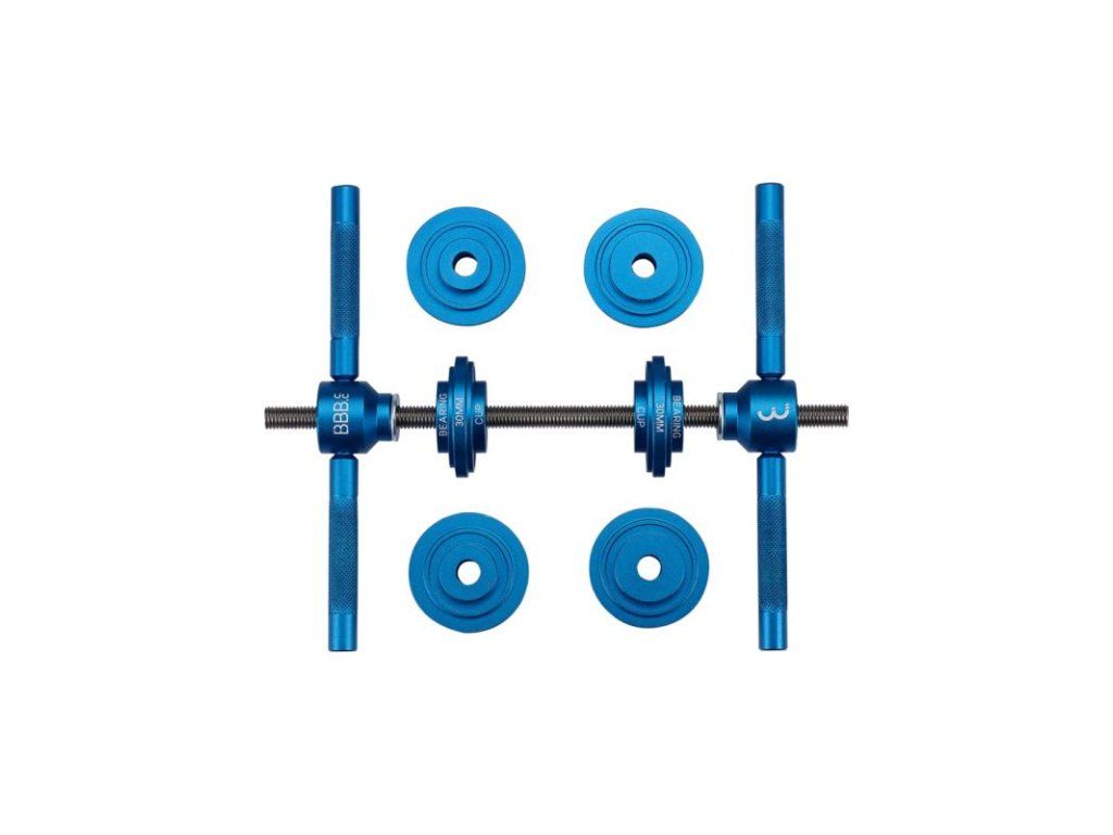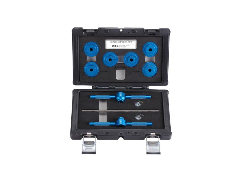 Aluminium-Werkzeugset zur Montage von Lagern im Tretlager. Kompatibel mit Achsdurchmessern von 22/24/29/30 mm. CNC-gefräste, doppelseitige Presshülsen für Tretlager und einzelne Lager. Kompatibel mit allen gängigen BBB-Tretlagern (auch anderer Hersteller). Komfortable und hochwertige Pressgriffe mit Versatz für einfache Handhabung. 240 mm lange Gewindestange für Kompatibilität mit jedem Tretlager. Lieferung im edlen Koffer mit Schaumstoffpolsterung zum Schutz der Werkzeuge beim Transport.