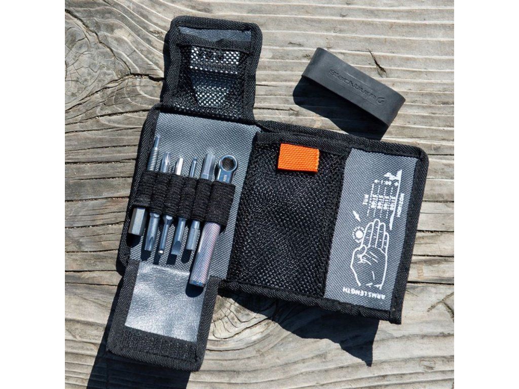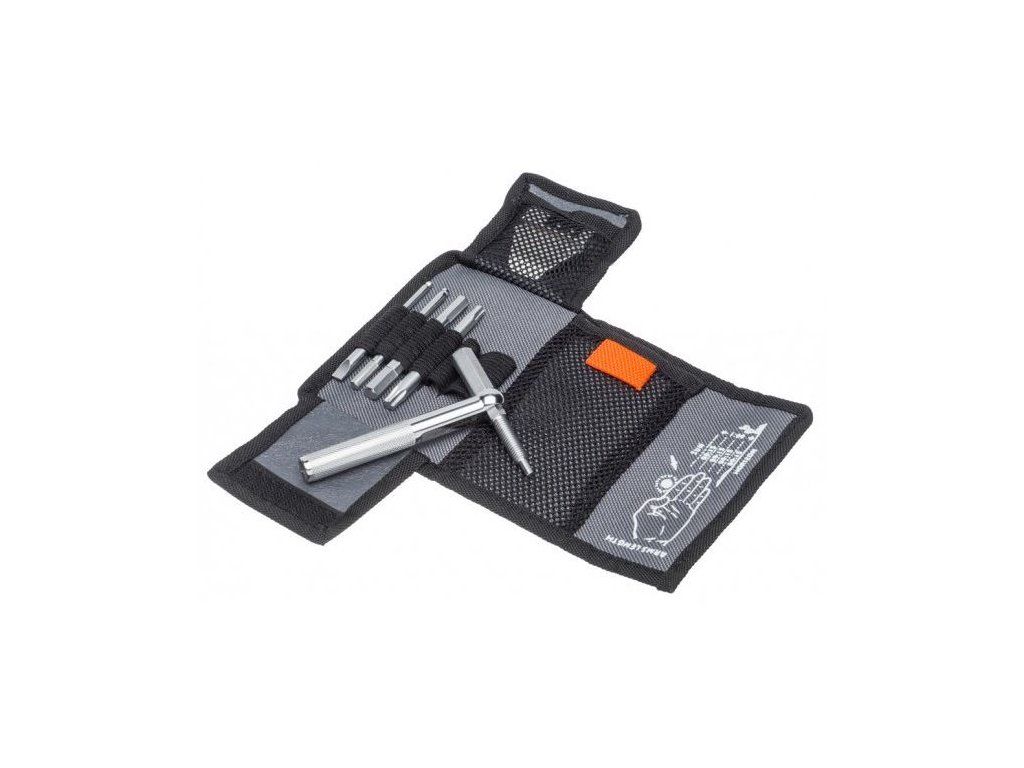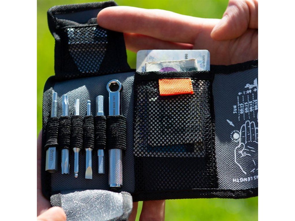 Ein einzigartiger Satz von 15 Werkzeugen, darunter ein praktischer Koffer, der auch Geld aufnehmen kann, eine ID-Karte oder eine Zahlungskarte. WERKZEUGE: Allbusschlüssel 2,5 / 3 / 4 / 5 / 6 / 8 mm • Flachkopfschraubendreher • T25 und T30 Torx-Schlüssel • Nieter • Zentrierenschlüssel #0, #1 und #2 • Bremsbelagtrenner.