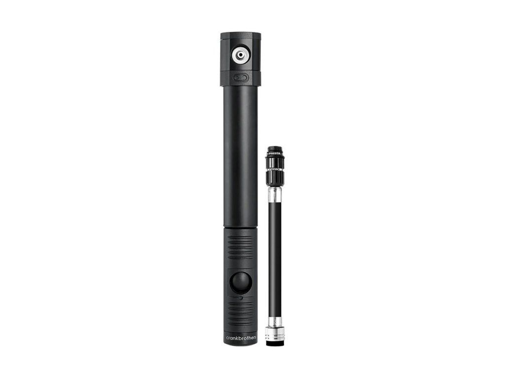 Luxuriöse Minipumpe mit klappbarem Griff, im Gehäuse integriertem Schlauch und patentiertem Magnetkopf, geeignet für beide Ventilarten. Inklusive Rahmenhalterung. Gewicht: 124 g, Länge: 220 mm, Maximaldruck: 110 psi / 7,6 bar. Midnight Edition – mattschwarz.