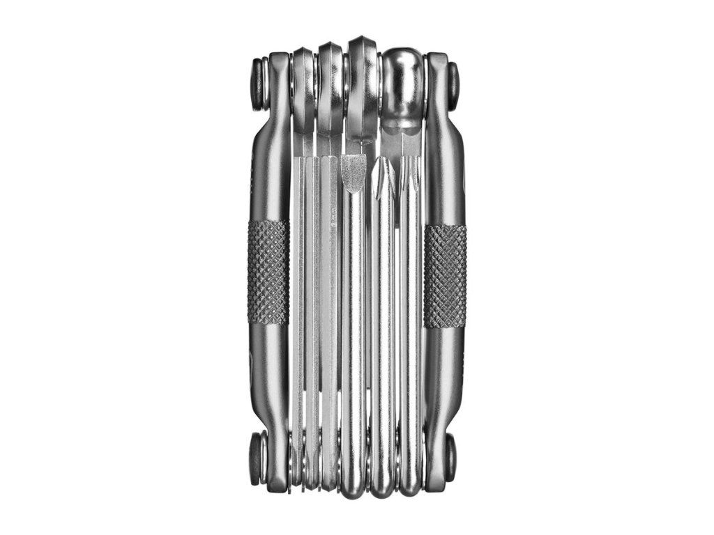 Leichtes 10-in-1-Werkzeug. Gewicht: 124 g. Länge: 89 mm. Material: Duraluminium 6061 T6. Werkzeuge: Hochfester Stahl. Innensechskantschlüssel: 2 / 2,5 / 3 / 4 / 5 / 6 / 8 mm. Schraubendreher: Kreuzschlitz und Schlitz. Torx-Schlüssel: T25.