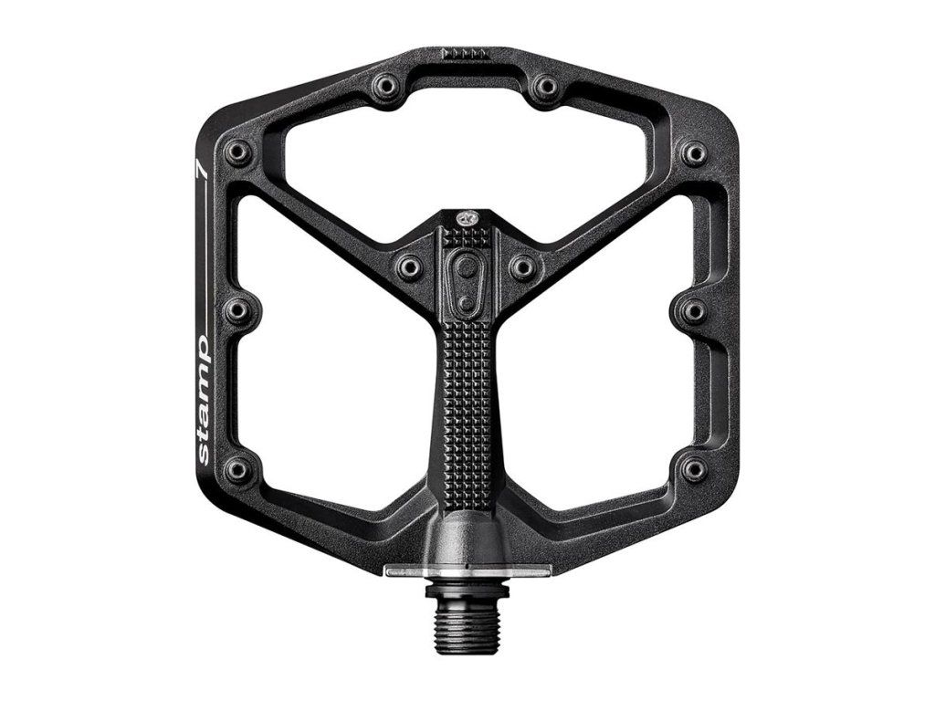 Plattformpedal in zwei Größen für verschiedene Schuhgrößen. Minimales Profil 11–13 mm. Gewicht 375 g. PLATTFORM: Aluminium 6061-T6 (114 x 111 mm, für Schuhgröße 43–49). ACHSE: Cr-Mo-Stahl 435. INNENLAGER: Igus LL Gleithülse. PINS: 10 pro Seite, austauschbar. TESTS IN DEN MEDIEN: http://www.bikeandride.sk/2016/11/pedaly-crankbrothers-stamp-large-prakticke-predstavene/
