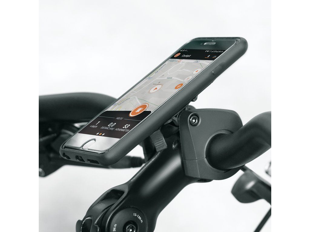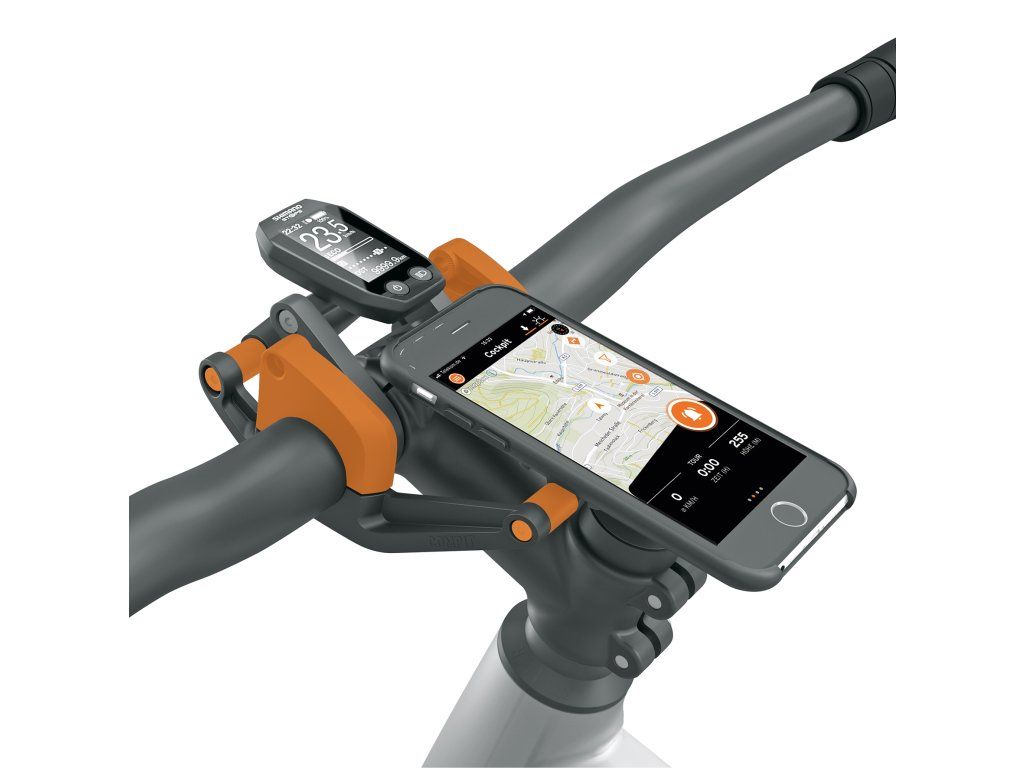 Winkelverstellbare Handyhalterung für den Lenker. Die COMPIT Handyhalterung lässt sich einfach an verschiedenen Fahrradlenkern montieren. Neben den Klemmarmen bietet das Komplettset mit den mitgelieferten Distanzstücken auch die Möglichkeit, die Halterung an E-Bikes mit zentralem Display anzubringen, sodass Smartphone und Bordcomputer eine geschlossene Einheit am Lenker bilden. Sicherer Halt mit einer einfachen Drehung. Mit einer einzigen Drehung lässt sich das Smartphone horizontal oder vertikal am Bajonettverschluss befestigen und genauso schnell wieder abnehmen. Zusätzlich kann es mithilfe der Winkelverstellung in die gewünschte Position gebracht werden. Die COMPIT hält das Handy fest und sicher, auch auf unebenem Gelände. Hinweis: Eine spezielle Handyhülle ist erforderlich! Kompatibel nur mit Bosch Nyon bis 2020. – Geeignet für alle Fahrräder – Bajonettverschluss – Horizontale und vertikale Montage – Verstellbarer Winkel – Mit Distanzstück für verschiedene Montageoptionen – Hergestellt in Deutschland. Verstellbare Handyhalterung für alle gängigen Lenker, sehr robust und sicher, selbst in extrem unwegsamem Gelände. Dank der Drehfunktion lässt sich Ihr Smartphone mithilfe des breiten Bajonettverschlusses horizontal oder vertikal befestigen und gleichzeitig durch Verstellen des Winkels in die gewünschte Position bringen. Im Lieferumfang ist ein Adapter für die Frontleuchte enthalten. Geeignet für Lenker mit Ø 22,2/25,4/31,8/35 mm. Eine Handyhülle oder ein Universaladapter (Art.-Nr. 11541) ist separat erhältlich. Optional kann ein Adapter für GoPro-Kameras (Art.-Nr. 11545) bestellt werden.