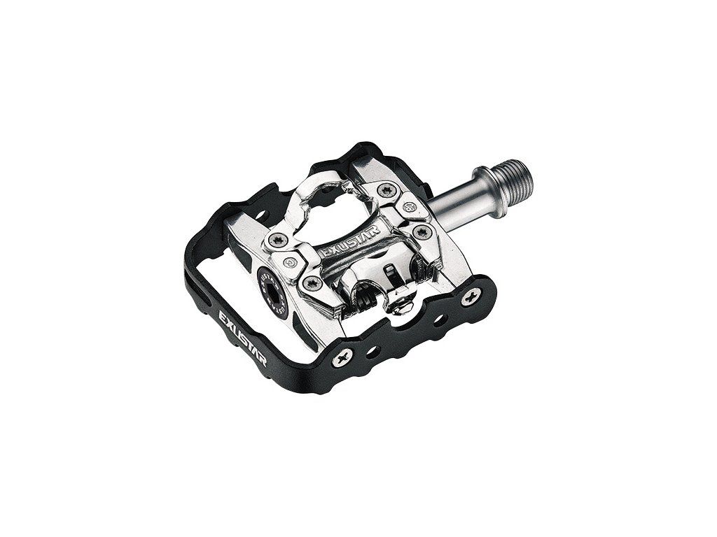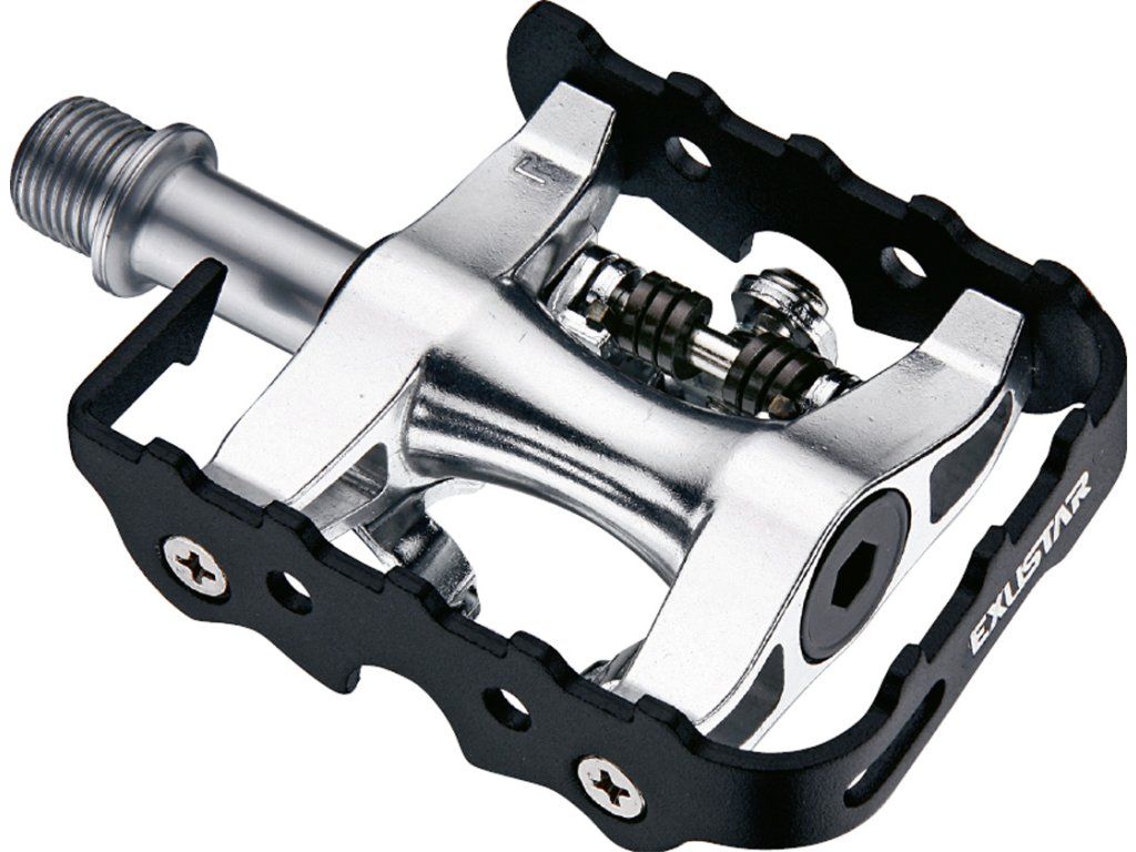 Das Exustar E-PM812 ist ein universelles Trekkingpedal mit drei verschiedenen Cleat-Systemen. Auf der einen Seite befindet sich ein SPD-System für Radschuhe, auf der anderen eine Plattform für normale Sportschuhe. Der Pedalkörper besteht aus eloxiertem Aluminium, die Achse aus Chrom-Molybdän-Stahl (CrMo) und das Doppellagersystem (Kugellager). Die einseitigen Buchsen sind vom Typ EPS-M (kompatibel mit Shimano MTB). Lager: Kugellager; Achse: Stahl; Körper: Aluminium; Abmessungen: 100 x 66 mm