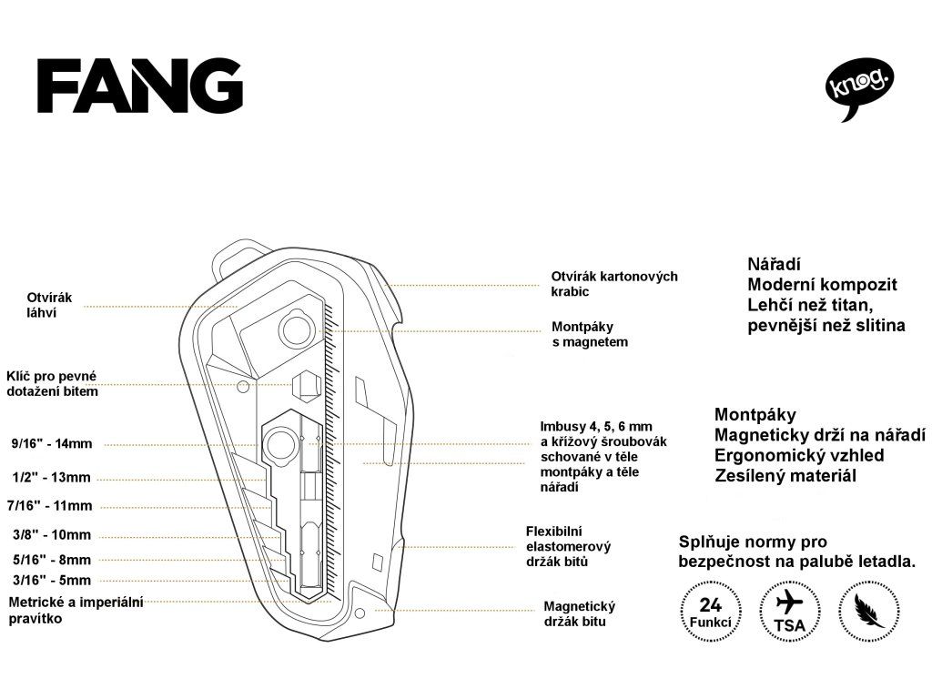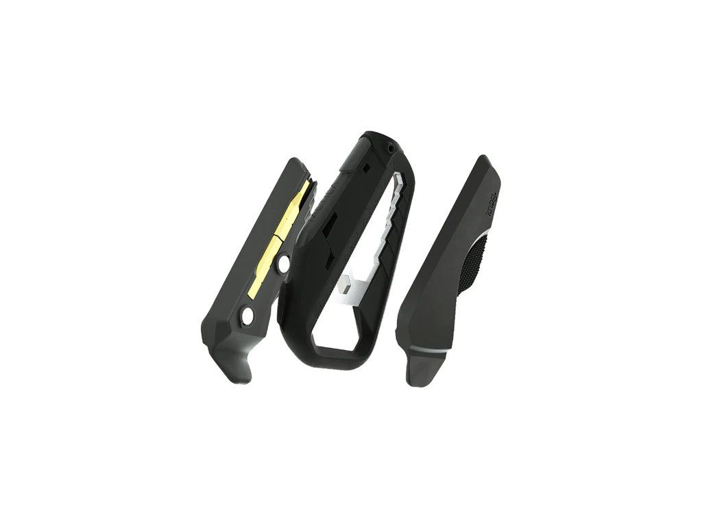 Das Multifunktionswerkzeug Knog Fang geht wieder einmal eigene Wege und hat eine Neuheit entwickelt, die sich von anderen Werkzeugen abhebt. Darüber hinaus ist es sogar flugtauglich, da es den TSA-Standards (Transportation Security Administration) entspricht. Es besteht aus einem robusten Verbundmaterial, das leichter als Titan ist. Neben Rohrzangen enthält es vier versteckte Bits, einen Kreuzschlitzschraubendreher und drei Inbusschlüssel (4, 5 und 6 mm). Dank des integrierten Kartonschneiders lässt es sich auch zum Auspacken von Paketen verwenden. Außerdem können Sie damit Bierflaschen öffnen oder verschiedene Schrauben festziehen.