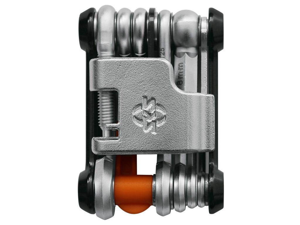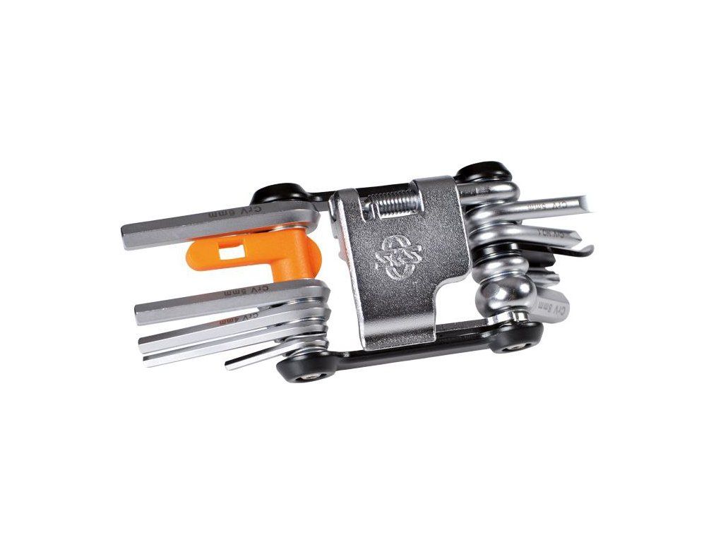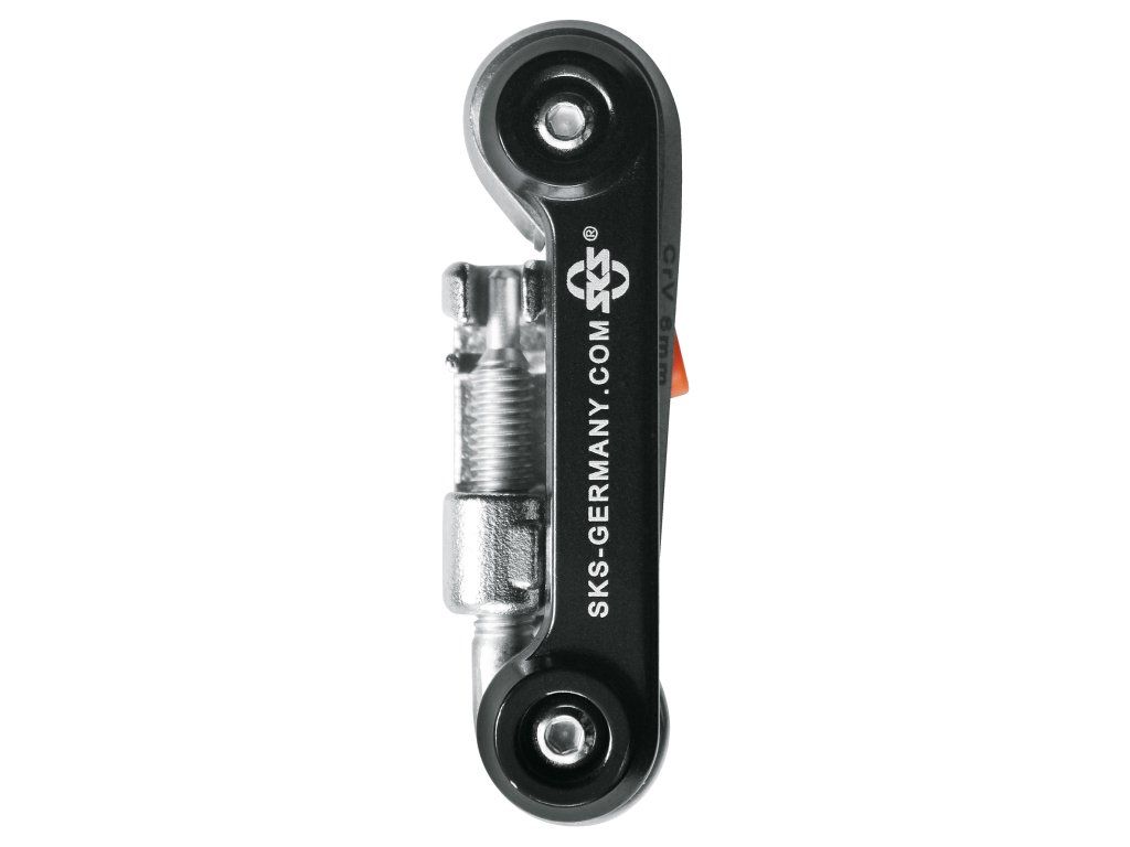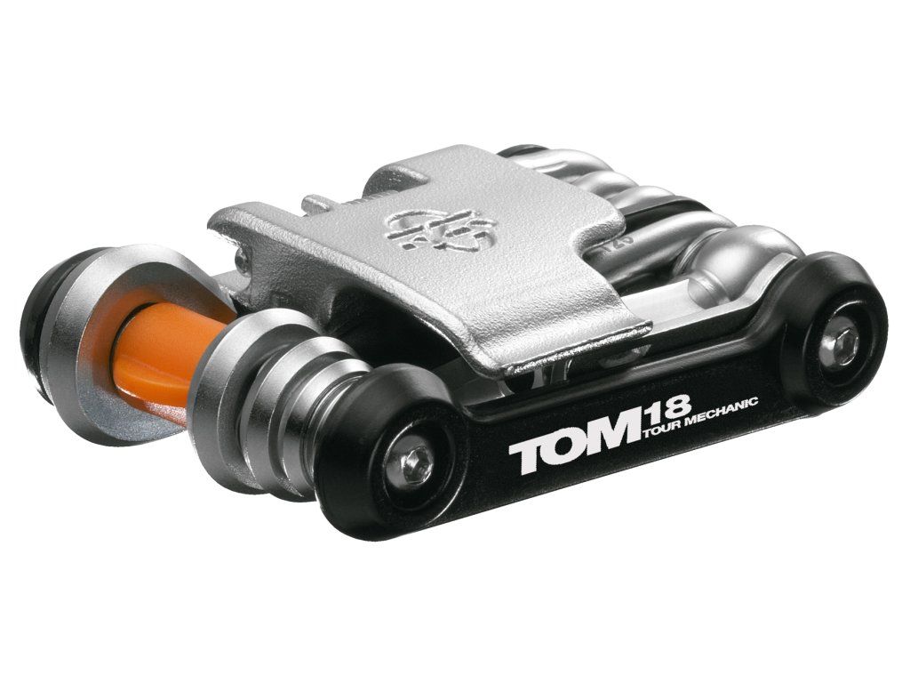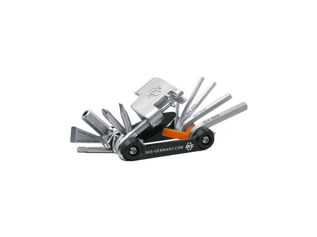 Das SKS TOM 18 ist ein 18-fach-Werkzeug mit Nietzange, Zentrierschlüssel und Flaschenöffner. Zum Lieferumfang gehört außerdem ein praktischer Koffer mit SKS-Logo. Nietzange, Inbusschlüssel: 2,5/3/4/5/6/8, Schlitz- und Kreuzschlitzschraubendreher, Torx, 252 Montagehebel, Zentrierschlüssel G14, G15, Flaschenöffner
