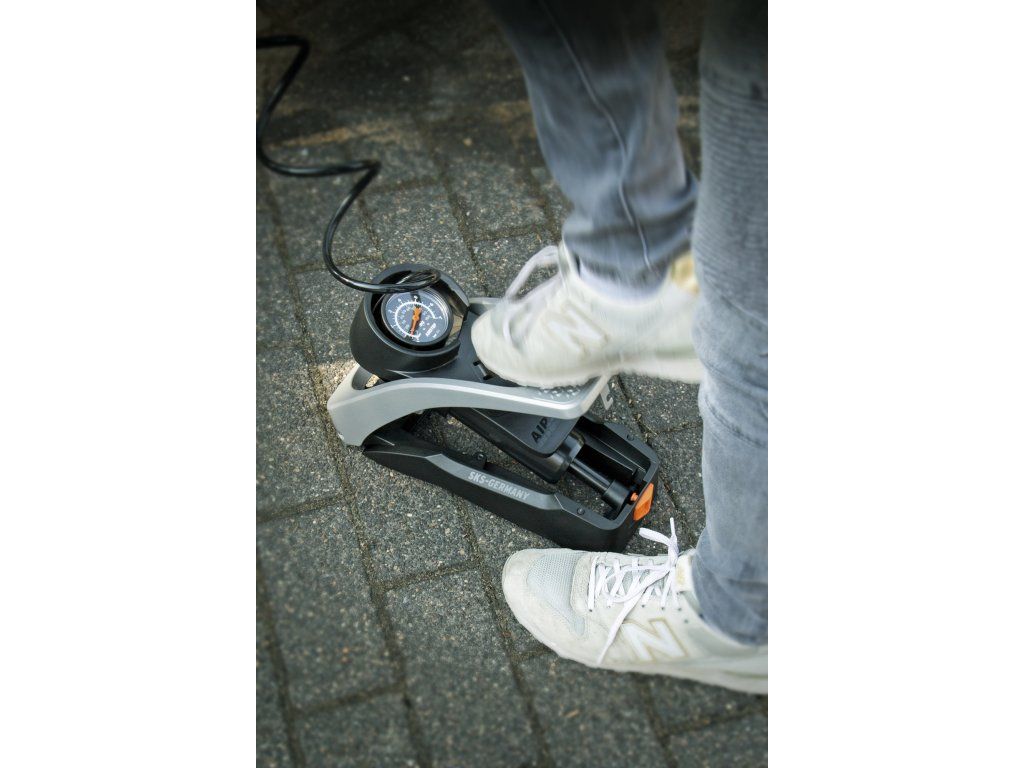 Die SKS Germany AirStep Fußpumpe vereint die Vorteile einer klassischen Pumpe mit modernster Technologie aus Deutschland. Hochwertige Materialien, ein durchdachtes Design und benutzerfreundliche Funktionen (großes Manometer, integrierter Spiralschlauch mit Ventilkopf für alle Ventilarten) verleihen der Pumpe ein innovatives Aussehen. Das ergonomische, robuste Aluminium-Fußpedal ermöglicht mühelos das Erreichen des maximalen Drucks von 7 bar/102 PSI. Aufpumpen war noch nie so einfach und rückenschonend. Nach dem Aufpumpen wird das Pedal platzsparend per Knopfdruck fixiert. Dank der mitgelieferten Wandhalterung kann die Pumpe auch aufgehängt werden. Maximaler Druck: 7 bar/102 PSI. Integrierter Schlauch für alle Ventilarten. Wandhalterung. Aluminiumgriff.