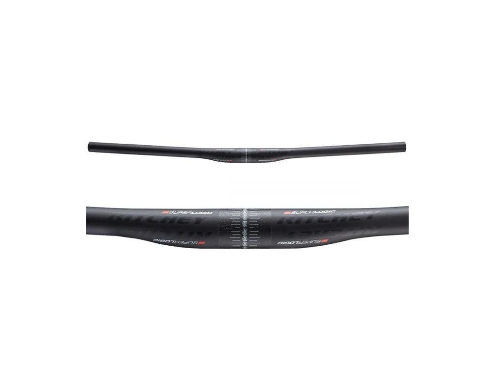 Hochwertiger Carbon-XC-Rennlenker Ritchey Superlogic. Material: Leichte Carbonfaser. Breite: 710 mm. Umkehrbar: +/- 5 mm flache Erhöhung. Krümmung nach hinten: 9°. Durchmesser: 31,8 mm. Anzugsmoment: 5 Nm. Farbe: Mattschwarz. Gewicht: 165 g.