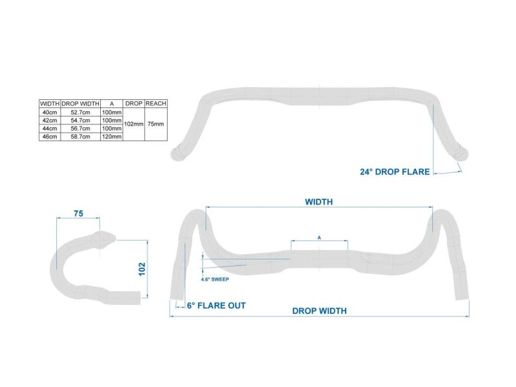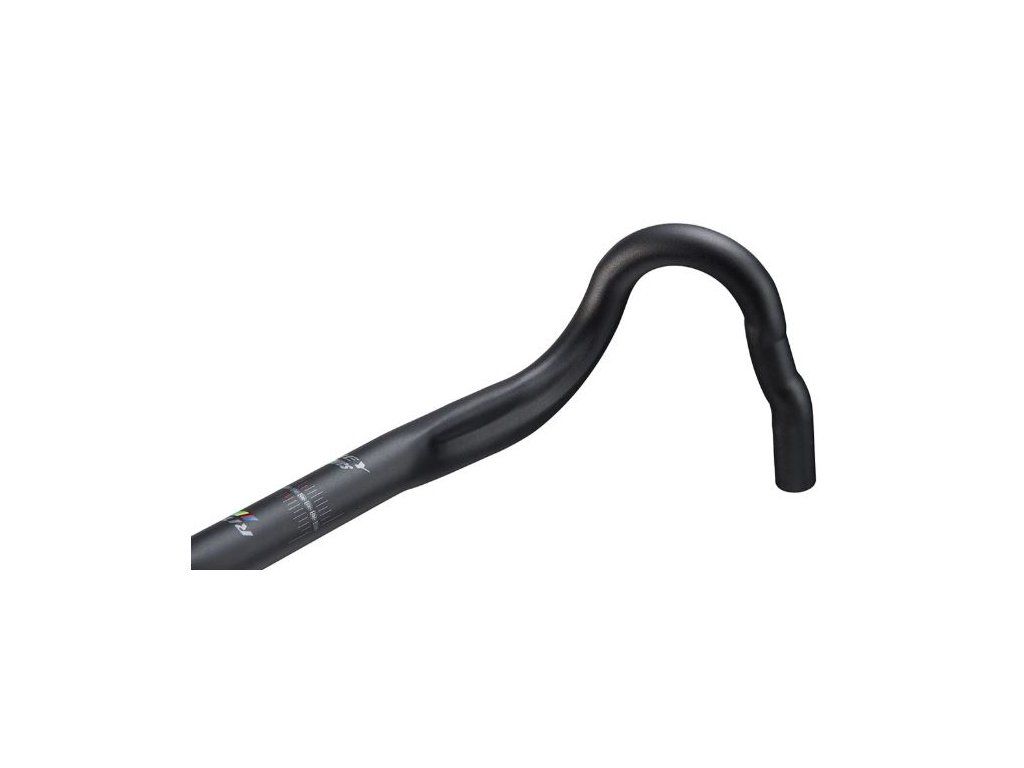Sehr komfortabler Gravel-Lenker. Der geringe Drop ist auch für weniger flexible Fahrer geeignet, da man sich selbst bei Griffen im unteren Fußgewölbe wohlfühlt. Der Lenker ist oben abgeflacht und bietet so einen komfortableren Griff, ähnlich wie bei der Carbon-Version. Man gewöhnt sich schnell an den Flare-Winkel und möchte danach nichts anderes mehr. Material: Dreifach konifizierte 7050-Aluminiumlegierung. Breite: 40, 42, 44, 46, 48, 50, 52 cm. Drop: 102 mm. Reach: 75 mm. Durchmesser: 31,8 mm. Flare-Winkel: 24°. Gewicht: 270 g (420 mm). Farbe: Schwarz. Kompatibel mit der Shimano EW-RS910 Verteilerdose. Nicht kompatibel mit dem Ritchey C260 Vorbau.