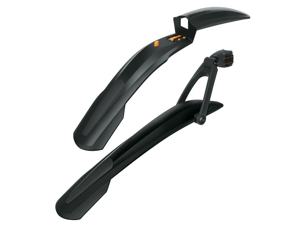 SKS Shockblade und X-Blade Schutzblechset für 26- und 27,5-Zoll-MTB-Laufräder in dezentem Schwarz. Dank des Schnellspannsystems lassen sich die Schutzbleche einfach an Gabel und Sattelrohr montieren. Im Lieferumfang enthalten sind fünf konische Adapter (15–35 mm) für den Gabelschaft. Material: Kunststoff. Zwei Gelenke ermöglichen die optimale Einstellung der Neigung des hinteren Schutzblechs. Für 26- und 27,5-Zoll-Laufräder. Maximale Reifenbreite: 3,0 Zoll. Länge des vorderen Schutzblechs: 605 mm. Länge des hinteren Schutzblechs: 550 mm.