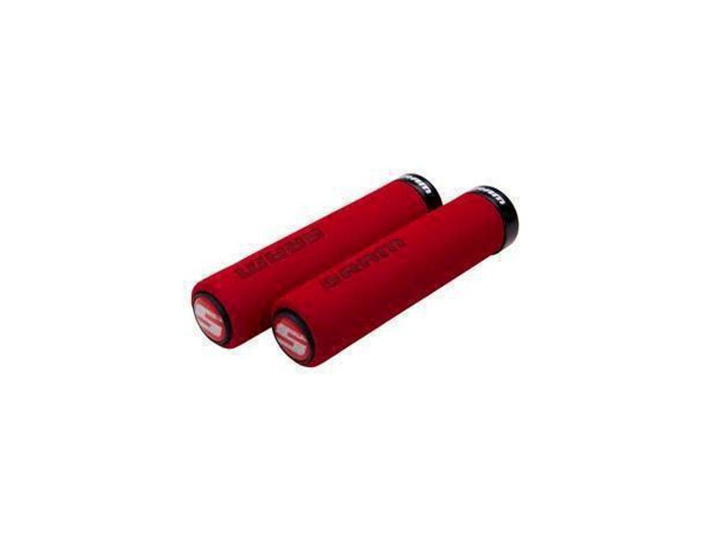 SRAM Locking Schaumstoffgriffe 129 mm rot mit einzelner schwarzer Klemme und Lenkerenden.