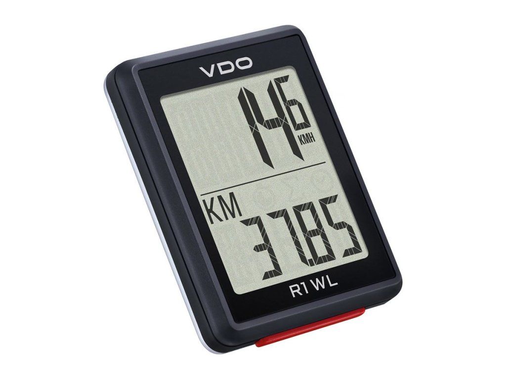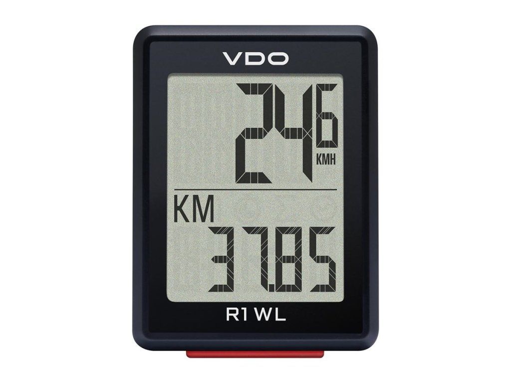 VDO R1 WL – Die Wahl nicht nur für Einsteiger. Der kabellose Fahrradcomputer VDO R1 WL ist ein zuverlässiger Begleiter für alle, die auf ihren Radtouren die fünf wichtigsten Werte im Blick behalten möchten – egal ob auf dem Weg zur Arbeit oder auf einer Wochenendtour. Das große, gut lesbare Display zeigt aktuelle Geschwindigkeit, Tages- und Gesamtstrecke, Fahrzeit und Uhrzeit an. Zur besseren Übersicht sind die einzelnen Funktionen mit Symbolen gekennzeichnet. Dank der markanten roten Funktionstaste ist die Einrichtung und Bedienung des R1 WL kinderleicht. Mit der integrierten Reifentabelle lässt sich der Radumfang im Handumdrehen einstellen. Die Lenkerhalterung für den wasserdichten Computer kann mit den mitgelieferten Kabelbindern schnell am Fahrrad befestigt werden. Anschließend kann der Computer einfach abgenommen und diebstahlsicher verstaut werden. Die kabellose Datenübertragung erfolgt über einen analogen Sender an der Fahrradgabel. Die mitgelieferte Batterie (CR2032) versorgt den Computer über zwei Jahre lang mit Strom. Funktionen: Momentangeschwindigkeit, Tagesdistanz, Gesamtdistanz, Fahrzeit, Uhr. Ausstattung: Analoge ATS-Funkübertragung, Symbolgesteuerte Funktionen, Integrierte Reifendrucktabelle, Automatischer Start/Stopp (mit 1-Stunden-Limit), Fahrzeit bis zu 100 Stunden, Automatischer Funktionswechsel, Wasserdicht nach IPX7. Lieferumfang: Fahrradcomputer (inkl. Batterie), Funkhalterung, ATS-Sender (inkl. Batterie), Magnet, Kabelbinder, Bedienungsanleitung. Optionales Zubehör (separat erhältlich): 64931 – VDO WL-Halterung 2032, 64940 – VDO ATS Bike 2 Kit 2032, 64934 – VDO Geschwindigkeitsmagnet.