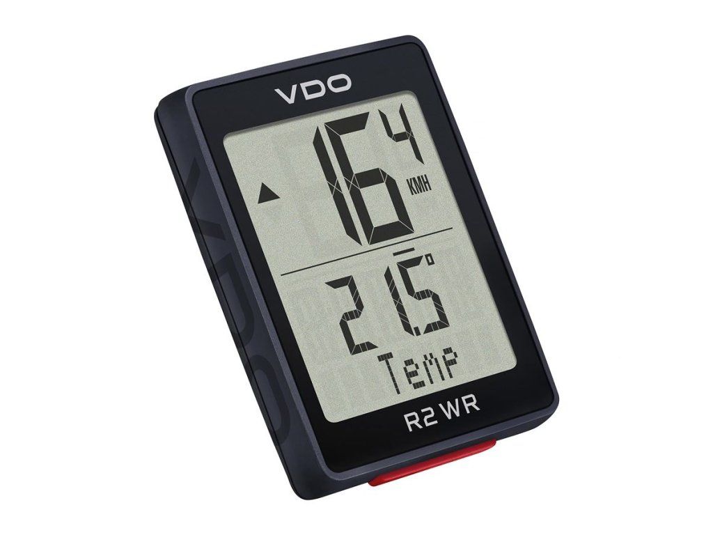VDO R2 WR – Der Fahrradcomputer für alle, die einen Extra-Motivationsschub brauchen. Mit dem kabelgebundenen VDO R2 WR haben Sie die zehn wichtigsten Werte Ihrer Fahrt immer im Blick – egal ob auf dem Weg ins Büro, beim Training oder auf einer Wochenendtour. Der R2 WR zeigt die aktuelle Geschwindigkeit, die Tageskilometer, die Fahrzeit, die Stunden, die Durchschnitts- und Höchstgeschwindigkeit, die Gesamtstrecke und -fahrzeit sowie die aktuelle Temperatur an. Zusätzlich vergleicht er die Durchschnitts- mit der aktuellen Geschwindigkeit. Das motiviert Sie, schneller zu fahren und Ihre eigenen Geschwindigkeitsrekorde zu brechen. Die Einrichtung und Bedienung des R2 WR ist dank der roten Menütaste kinderleicht. Auch die Einstellung des Radumfangs ist dank der integrierten Reifentabelle ein Kinderspiel. Die Lenkerhalterung für den wasserdichten Computer lässt sich mit den mitgelieferten Kabelbindern schnell am Fahrrad befestigen. Anschließend kann der Computer einfach abgenommen und diebstahlsicher verstaut werden. Die Kabelverbindung zwischen Sender und Computer gewährleistet eine reibungslose und zuverlässige Geschwindigkeitsmessung. Die Batterie (CR2032) versorgt den Computer über zwei Jahre lang mit Strom. Funktionen: Momentangeschwindigkeit, Durchschnittsgeschwindigkeit, Vergleich von Momentan- und Durchschnittsgeschwindigkeit, Höchstgeschwindigkeit, Tageskilometer, Gesamtkilometer, Fahrzeit, Gesamtfahrzeit, Uhr, Thermometer. Merkmale: Auswahl aus 7 Sprachen mit Volltextanzeige, integrierte Reifendrucktabelle, automatische Start/Stopp-Funktion, Datenerhalt beim Batteriewechsel (Zusammenfassungsdaten und Einstellungen), wasserdicht gemäß IPX7. Lieferumfang: Computer (inkl. Batterie), Kabel, Magnet, Kabelbinder, Bedienungsanleitung. Optionales Zubehör (separat erhältlich): 64930 – VDO WR-Halterung 2032, 64934 – VDO Geschwindigkeitsmagnet.