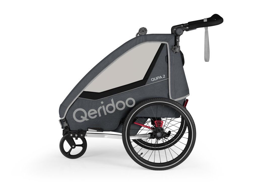 Zweisitziger, gefederter Kinderfahrradanhänger Qeridoo Qupa 2. Er bietet komfortable Sitze mit adaptivem 5-Punkt-Gurt und ein Multiwheel-Rad mit Feststellfunktion. Empfohlen für Kinder bis zu einer Körpergröße von 116,5 cm. KOMFORT Komfortabler Sitz mit adaptivem 5-Punkt-Gurt Multiwheel – Kinderwagenrad mit Jogger-Funktion (Feststellfunktion) Höhenverstellbarer Schiebegriff mit Kippschutz 3-in-1-Dach (Insektenschutz, Sonnenschutz und Spritzwasserschutz) Anhängerkupplung mit Universalkupplung und Schnellwechselsystem BDS+ Elastomer-Blattfeder-Dämpfungssystem Feststellbremse mit Handbedienung Praktischer Stauraum Kompakte Größe zusammengeklappt ABMESSUNGEN Kabinenhöhe: 90 cm Schiebegriffhöhe: 68–125 cm Maße zusammengeklappt: 105 x 76 x 36 cm Max. Gesamtgewicht: 60 kg Kofferraumvolumen: 40 l SICHERHEIT Entwickelt und geprüft nach DIN EN 15918 / Schadstoffgeprüft Verstärkter Aluminiumrahmen mit Bodenschutz Niedriger Schwerpunkt für höhere Stabilität Erhöhte Innenraumhöhe Heckaufprallschutz Befestigungssystem mit 5-Punkt-Sicherheitsgurt und innovativer Steuerung Seitliche Kopfprotektoren mit Reflexfolie Reflektierende Elemente an den Reifen LIEFERUMFANG Kabine mit Antriebsachse, BDS-Federung und Feststellbremse Kinderwagenrad mit Jogger-Funktion (arretierbar) 20"-Räder mit Reflexelementen Höhenverstellbarer Griff Aufschiebbarer Radabweiser Aufschiebbare Kopfprotektoren Aufschiebbare Blattfederabdeckung Deichsel mit Feder Universalkupplung mit M5-Untersetzung Rücklicht Sicherheitsfahne Inbusschlüssel und Schlüsselgröße 13 Bedienungsanleitung